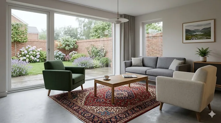 Size First, Always: British rooms run smaller than American equivalents. Measure your space carefully, accounting for furniture placement. A rug should either sit entirely under furniture (larger rugs in open-plan spaces) or entirely in front (smaller accent rugs). The awkward middle ground — rug half-under sofa — looks messy and creates trip hazards. For standard UK living rooms (roughly 4m x 5m), 160 x 230 cm represents a versatile size. Terraced house hallways typically need 60-80 cm width.